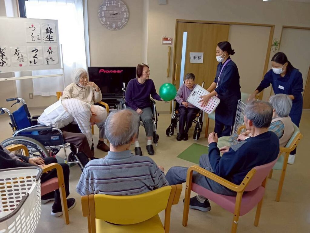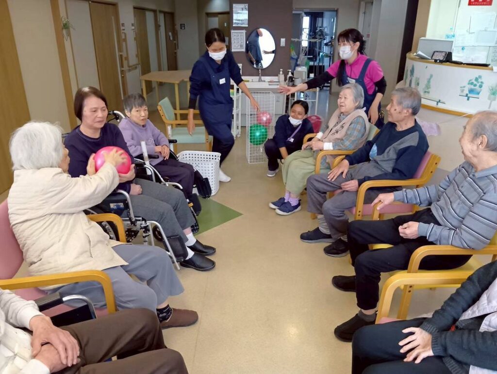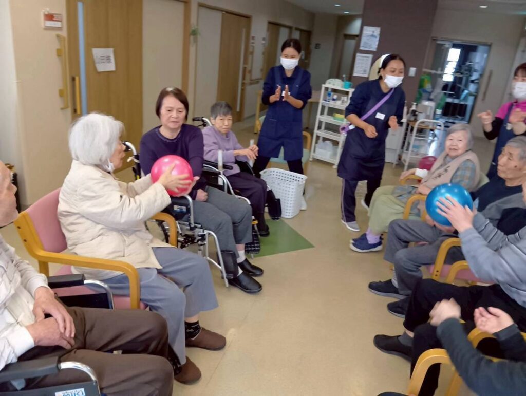 色とりどりのボールを使って、隣の方へパスをつなげたり、カゴを狙ってシュートしたり。 「それっ!」「入ったー!」と、フロア中に元気な声と笑い声が響き渡りました。 座ったままでも、しっかり腕を伸ばして全身を使うことで、良いリフレッシュになったようです。