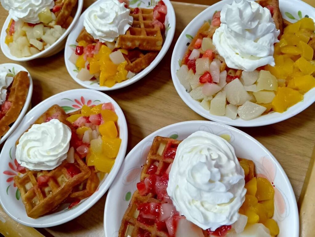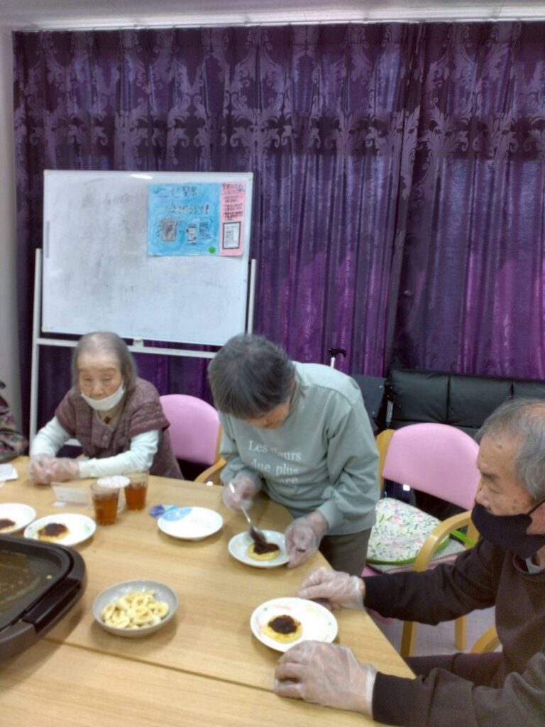 🍡 おやつレク:みんなで作って、美味しく談笑。白桃プリンや、どら焼きも
